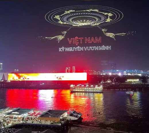 在越南50周年庆典之夜,璀璨的无人机演出在城市上空震撼上演。10500架无人机在夜空中精准编队,缓缓勾勒出“VIET NAM KY NGUYÈNVUON MÌINH”字样,光影层层展开,气势恢宏。下方江面灯火倒映,与城市天际线交相辉映,展现出现代越南蓬勃发展的城市风貌。整场无人机表演将科技、艺术与情感深度融合,向世界传递出越南迈向新时代的自信与力量。