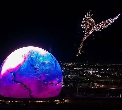 在美国拉斯维加斯地标性建筑——巨型球形建筑(Sphere)上空,一场极具未来感的无人机表演震撼上演。夜幕之下,巨球外立面呈现出绚丽的蓝紫色地球影像,仿佛一颗悬浮于城市之上的“未来星球”,与周围璀璨的城市灯光相互映衬。与此同时,无人机在空中精准编队,化作一只展翅腾飞的光影飞鸟,从高空掠过球体上方,线条流畅、姿态灵动,象征着科技、自由与突破。
